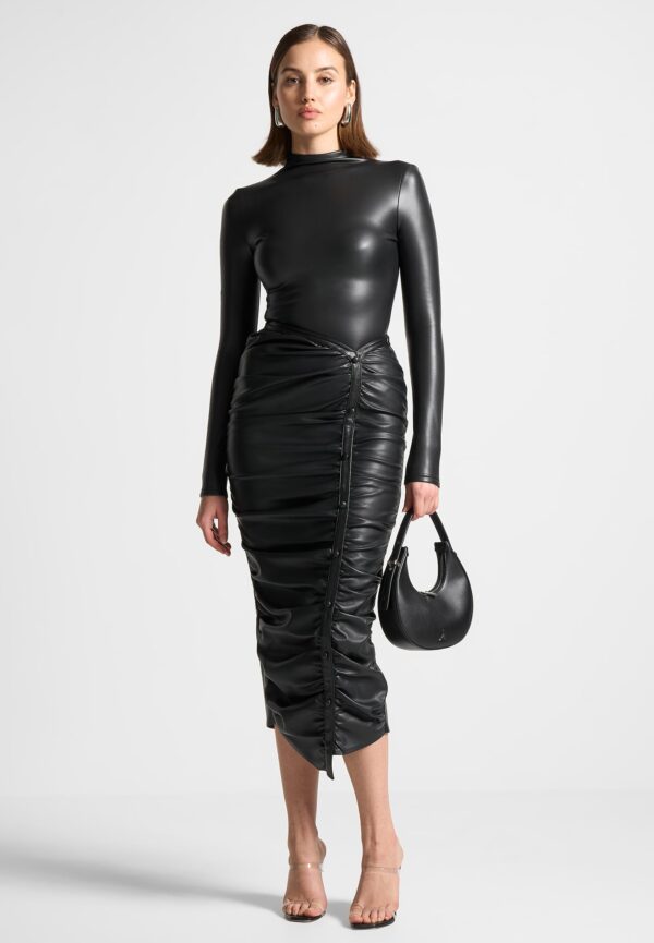 This beautiful and sleek Faux Leather Mock Neck Bodysuit in black is perfect for a stylish look. It features a high neck and long sleeves, ensuring maximum comfort and coverage. Crafted from premium grade vegan leather, this bodysuit is sure to make you stand out.