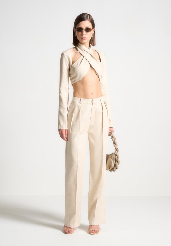 Expertly crafted from quality linen, these straight leg trousers feature delicate pleat detailing for a sophisticated touch. The soft texture of the fabric adds comfort to style. Elevate your wardrobe with these dual pleat trousers in a natural colour.