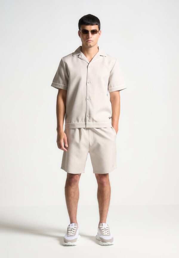 Expertly crafted with a pinstripe detail, these Beige shorts offer both style and comfort. The elasticated waistband ensures a perfect fit, while the matching Pinstripe Revere Shirt completes the look. Elevate your wardrobe with these versatile shorts.