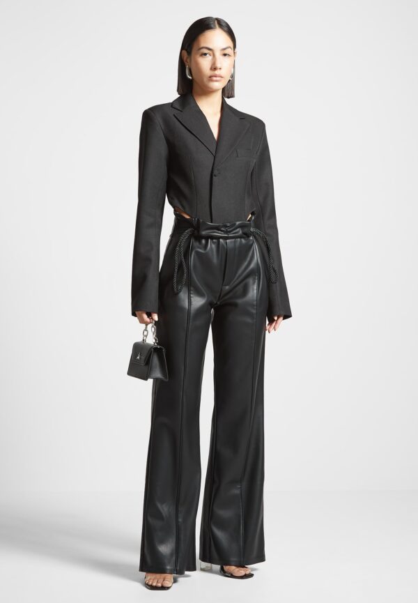 The Tailored High Leg Blazer Bodysuit in black is a fashionable staple that provides a flattering fit. It features a classic lapel collar for a sophisticated and polished look. Perfectly tailored for any occasion.